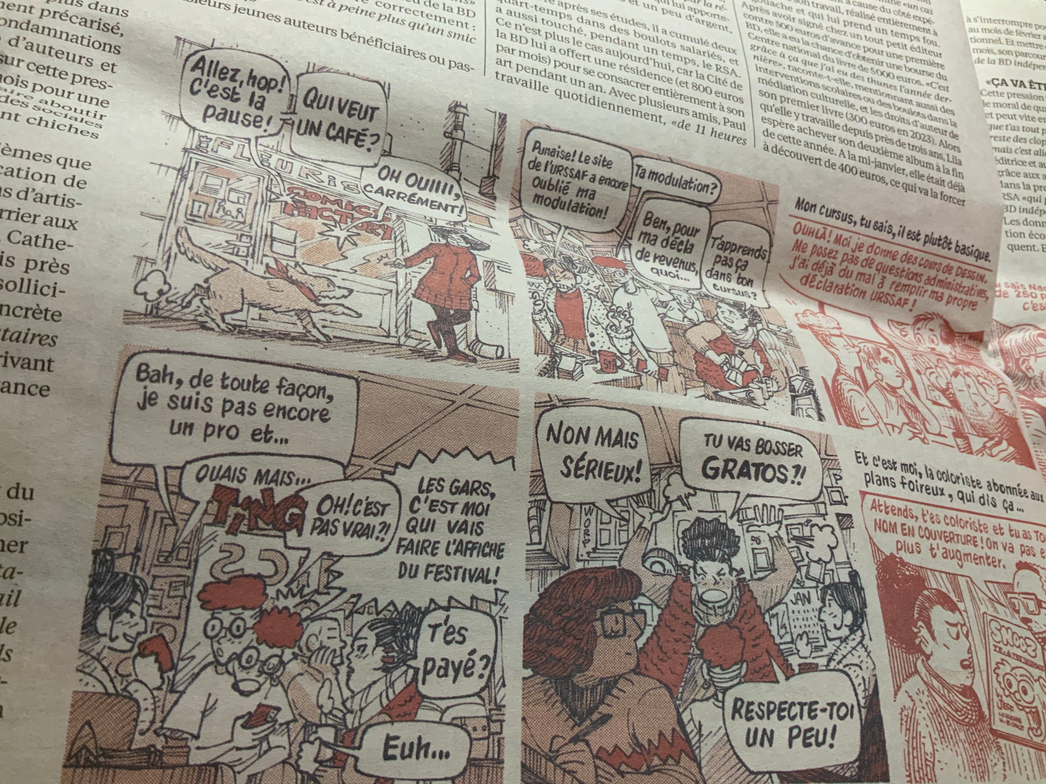 À l’occasion du FIBD, avec les camarades Marie-Paule Noël et Bonaventure du STAA (le syndicat des travailleurs·euse·s Artistes-Auteurices, confédéré à la CNT-SO) nous avons réalisé une petite BD publiée dans le LIBÉ spécial BD, qui accompagne un article de Jean-Baptiste Chabran, à propos de la réforme du RSA en soulignant les effets pervers sur les travailleurs·euse·s de l’édition de bande dessinée. Bien entendu, le STAA demande purement et simplement l’abrogation de la réforme pour tous les allocataires, artistes-auteur·ice·s ou non.